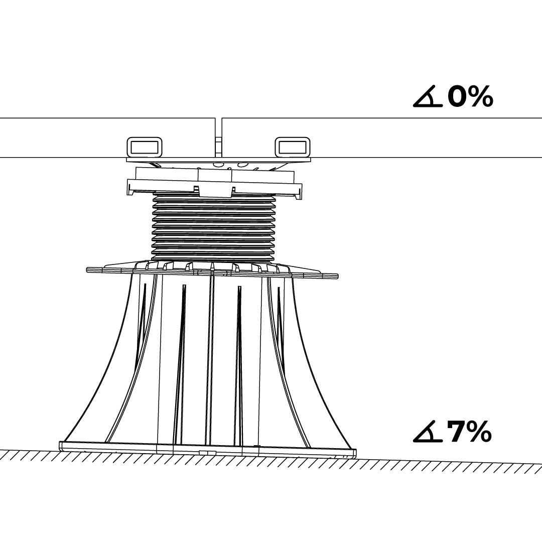 Głowica samopoziomująca DD GROUP LE 7% (kod DDP LE / 10170) to innowacyjny dodatek do wsporników regulowanych serii STANDARD – pozwala na idealne wypoziomowanie płyt tarasowych nawet na podłożu o nachyleniu do 7%. Pod wpływem ciężaru płyt głowica samoistnie się ustawia, korygując spadek – zero dodatkowych klinów czy regulacji ręcznej!