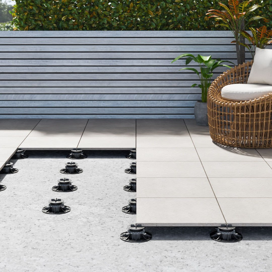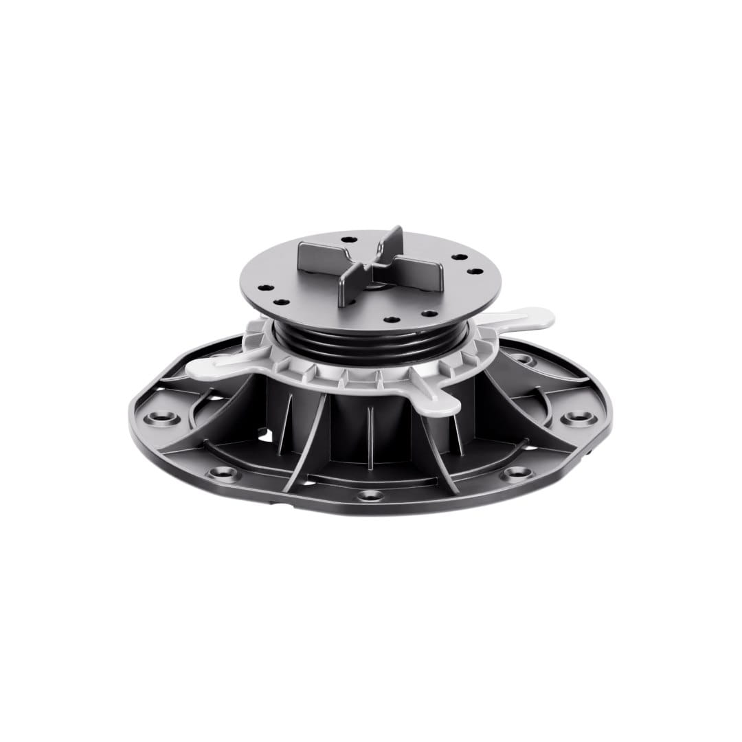 Wspornik regulowany w zakresie 45–70 mm z wbudowanym dystansem 3 mm (opcja 5 mm). Nośność min. 1000–1100 kg/szt., płynna regulacja nawet po ułożeniu płyt, duża podstawa Ø 177 mm, mrozoodporny i UV-odporny. Idealny na tarasy z lekkim spadkiem, balkony i nierówne podłoże.