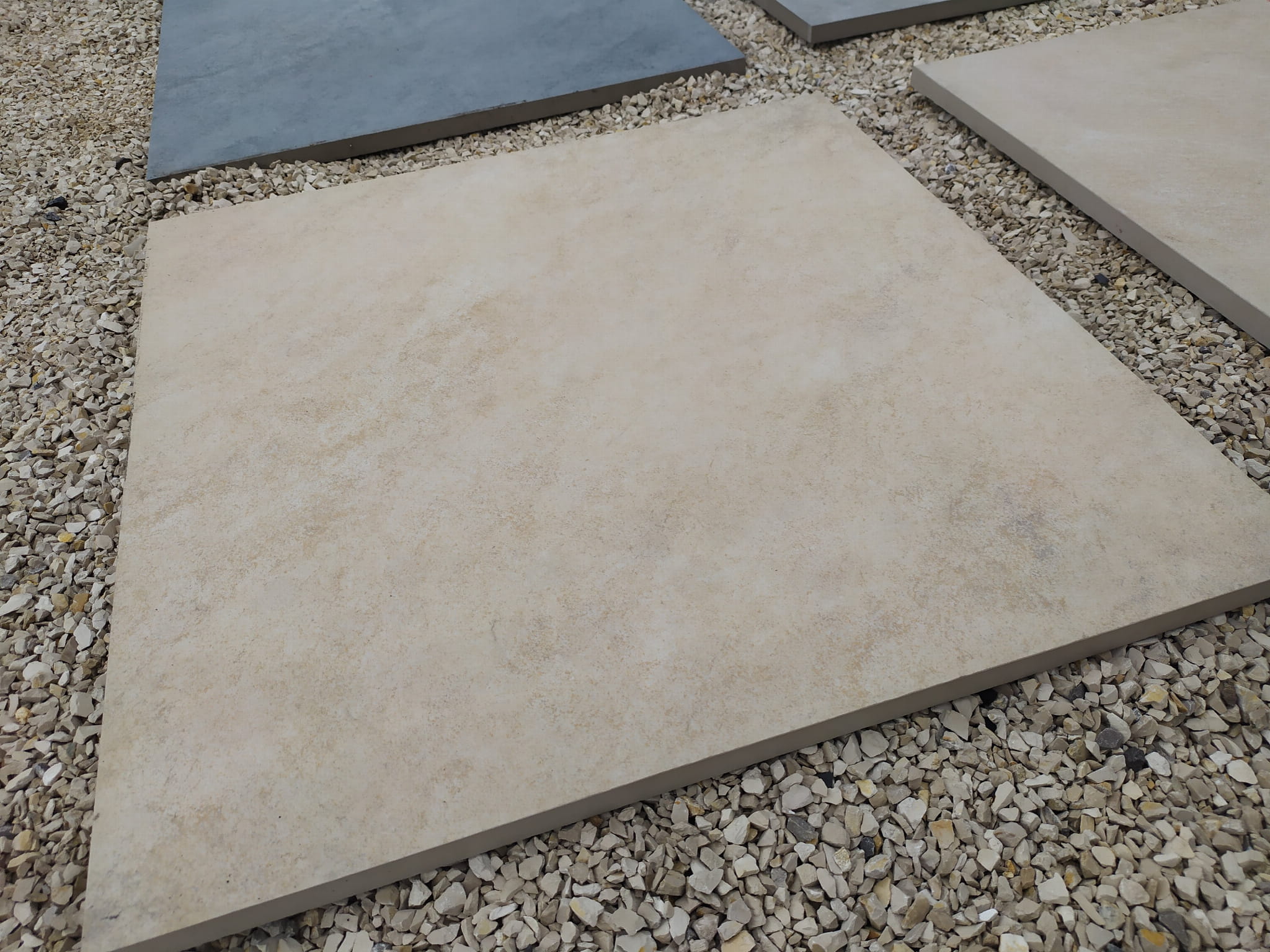 Ciepły beż mat z naturalnym, surowym wzorem betonu, grubość 20 mm, antypoślizgowy R11, mrozoodporny, rektyfikowany, gatunek 1. Idealny na tarasy, balkony, podjazdy, ścieżki, duże powierzchnie zewnętrzne i techniczne w ciepłym, minimalistycznym / nowoczesnym stylu – nie przegrzewa się mocno w słońcu.