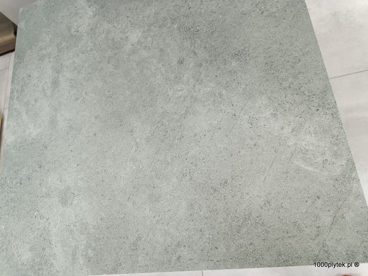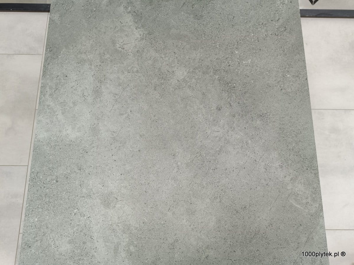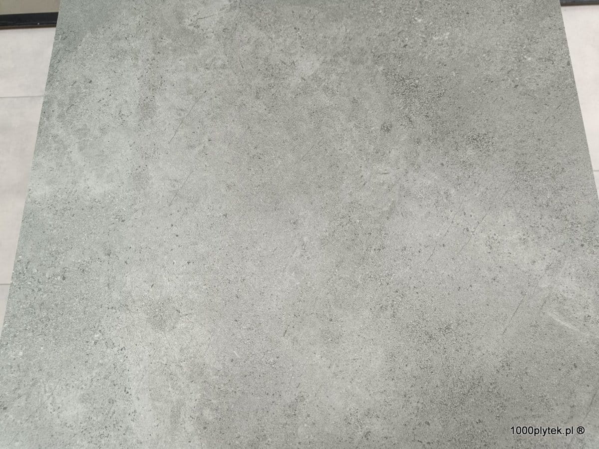 Średnio-szary mat betonowy / cementowy z subtelną fakturą, grubość 2 cm, R11 bardzo antypoślizgowy, mrozoodporny, gatunek I. Idealny na tarasy wentylowane, balkony, ścieżki, strefy basenowe i aranżacje miejskie/industrialne.