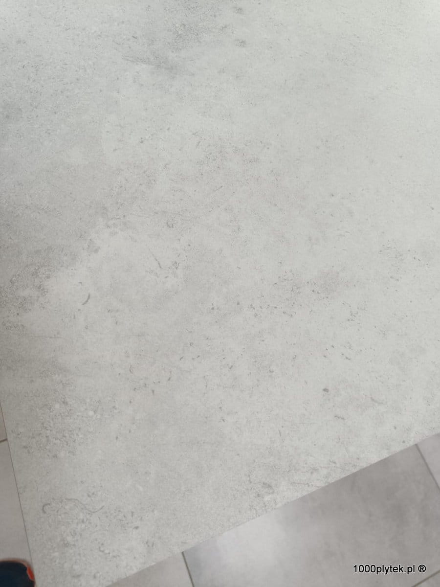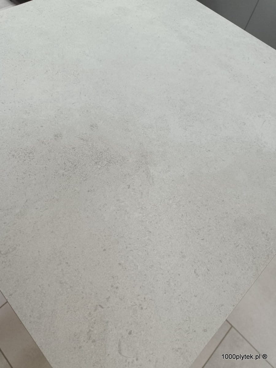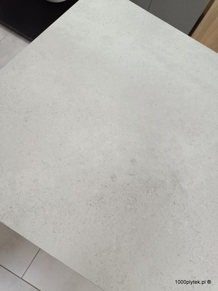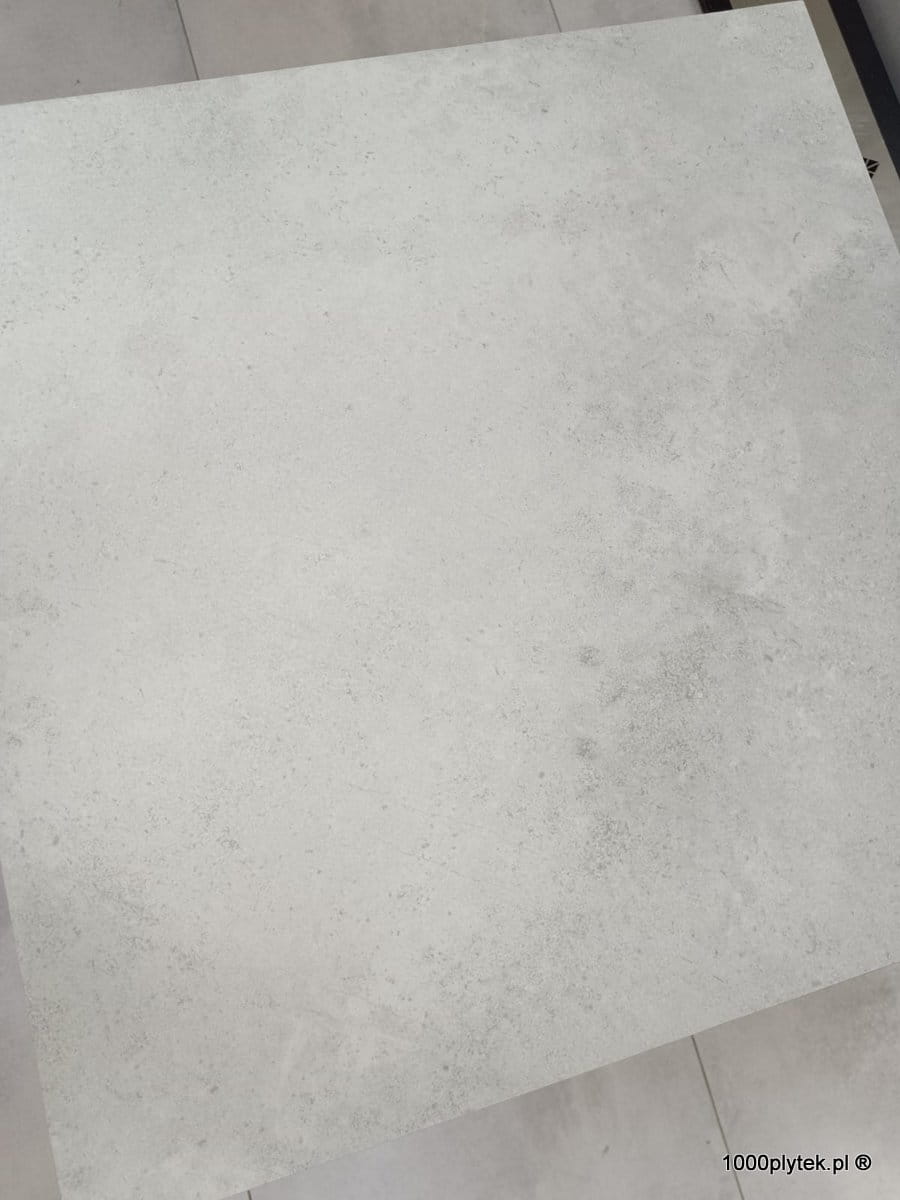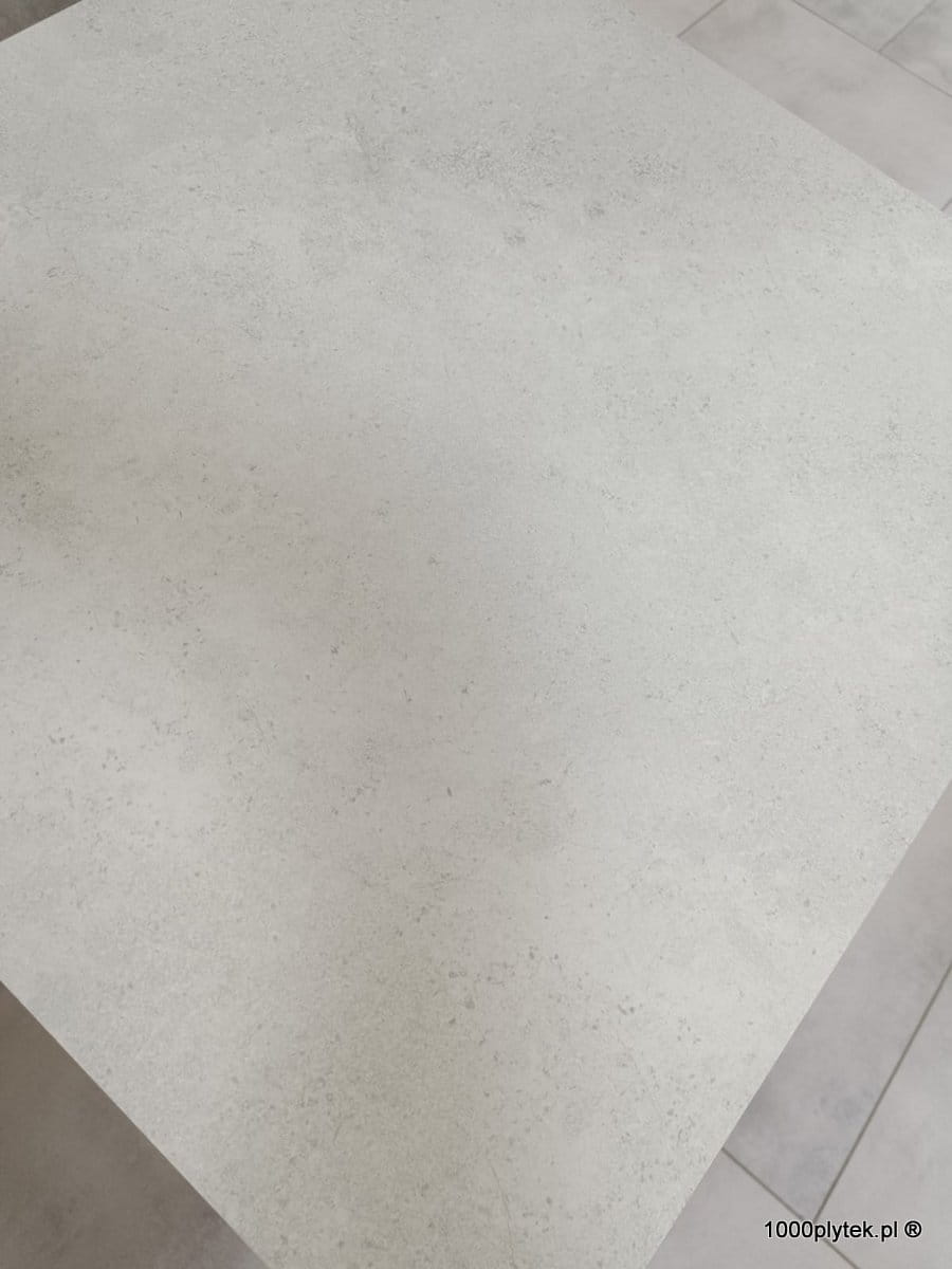 Jasny biały / biało-szary mat betonowy / cementowy, grubość 2 cm, antypoślizgowy R11, mrozoodporny, rektyfikowany, gatunek I. Idealny na tarasy wentylowane, balkony, ścieżki, strefy basenowe i nowoczesne, minimalistyczne aranżacje – duży format 60×120 optycznie powiększa przestrzeń.