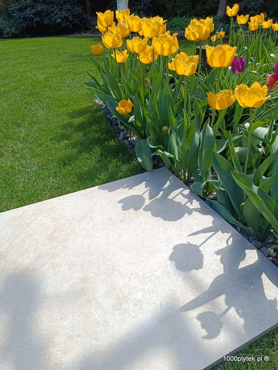 • Rektyfikowane krawędzie – minimalne fugi – taras wygląda jak monolityczna, jasna kamienna posadzka premium