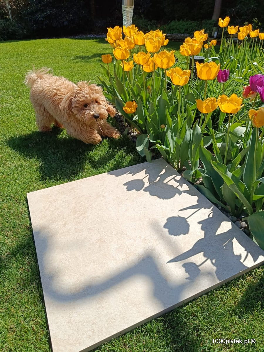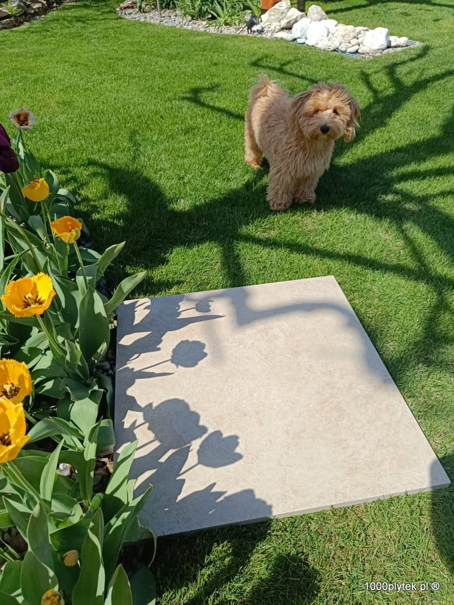Ciepły beż mat kamieniopodobny / betonowy, grubość 2 cm, R11 bardzo antypoślizgowy, mrozoodporny, gatunek I. Idealny na tarasy wentylowane, balkony, ścieżki, strefy basenowe i aranżacje z drewnem / zielenią.