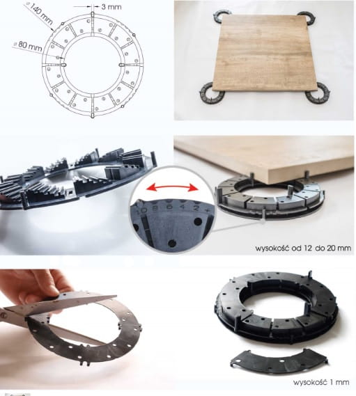 Minimalna różnica wysokości płyt tarasowych 1-2 mm psuje cały efekt? Podkładka wyrównująca C 1 mm to genialny, cienki dodatek do systemu ABC – pozwala precyzyjnie wyrównać narożniki lub całą powierzchnię tarasu wentylowanego 2 cm. Stosowana wyłącznie POD lub NA podstawce „A” (lub w zestawie z B) – niweluje drobne nierówności podłoża, tolerancje produkcyjne płyt czy minimalne spadki. Taras idealnie równy, bez „klawiszowania”, bez dodatkowych kosztów – must-have przy dużych formatach jak Wetwood, Willow czy 60×60 cm. Polski system premium Eko-Bord ABC – trwałość na dekady!